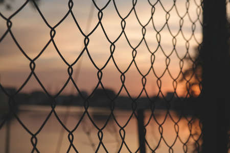metal mesh fence. sea at sunset behind the net. restraint of liberty