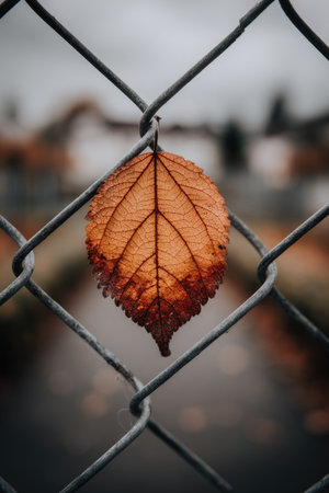 An autumn leaf, transitioning in color from orange to brown, is suspended on a gray chain-link fence. The close-up shot uses shallow depth of field, blurring the background. The scene suggests an outdoor setting under overcast skies. Suitable for various editorial and commercial applications related to nature or seasonal themes.