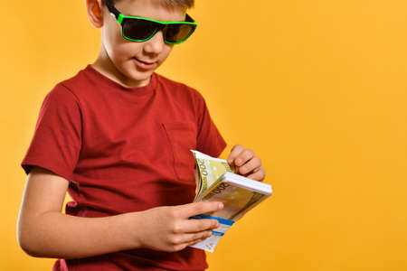 A boy in sunglasses considers banknotes in a bundle, a glamorous and stylish child with currency on a yellow background.