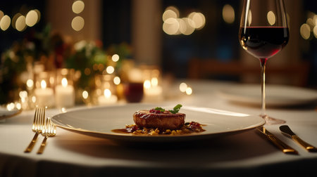 Elegant dinner setting with gourmet meal and warm candlelight at a cozy restaurant