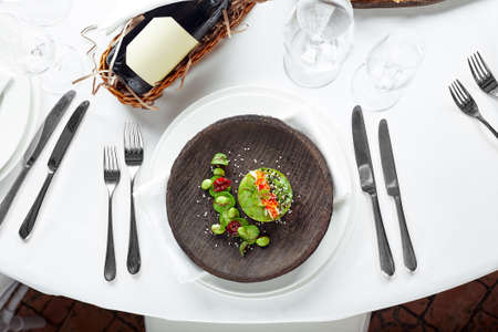 Chef to table, finely decorated delicious restaurant dish. Haute Cuisine Food.