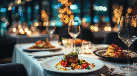 Elegant dining scene featuring a gourmet plate and glass, set against a blurred background of glowing lights.