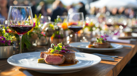 Elegant outdoor dining with gourmet steak and wine during a sunny afternoon gathering