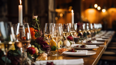 A beautifully set dining table featuring exquisite gourmet dishes, elegant glassware, and floral decorations creating a warm, inviting atmosphere for celebration.