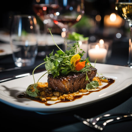 A top-down view of an elegantly plated meal in a high-end restaurant. The soft bokeh lighting in the background accentuates the fine dining experience.