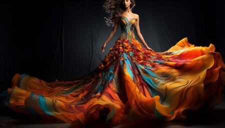 Fashion photo of a beautiful woman in a luxurious evening dress with colorful fabric.