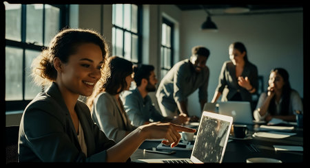A group of professionals working together in a bright office, using laptops and engaging in discussion. The mood is collaborative and focused.