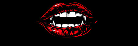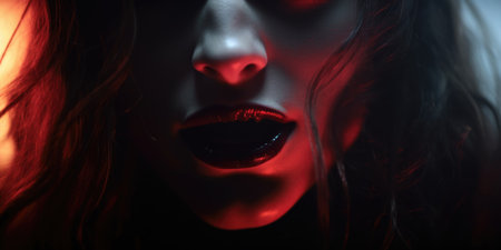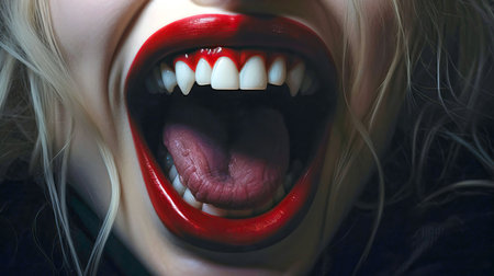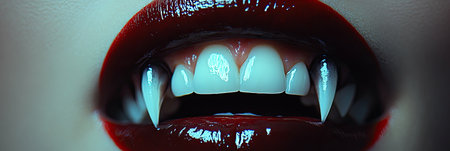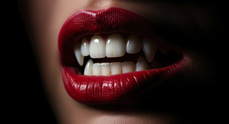 Woman mouth with vibrant red lipstick revealing sharp, elongated vampire fangs and white teeth. dark, mysterious, and seductive halloween concept.