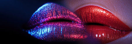 Glossy lips display a vibrant shine, highlighting rich colors in a close-up view under studio lighting, emphasizing texture and gloss.