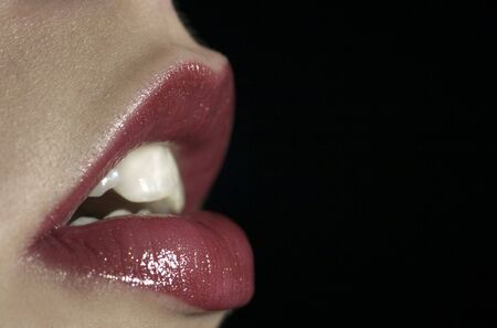 Tense female lips and teeth in the dark, emotion of anger and rage, crib and rage, lips and mouth