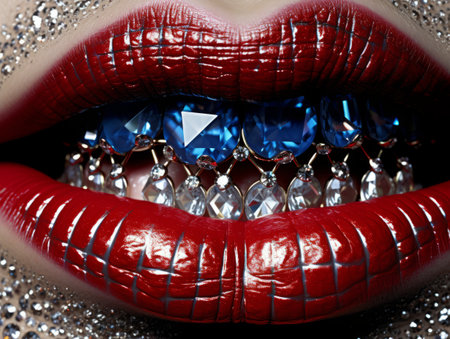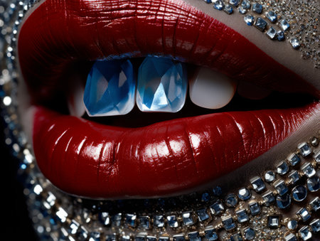 Womans lips decorated with rhinestones and blue crystals on the teeth AI