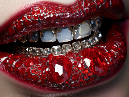Crystal grillz teeth in a womans mouth with plump lips painted with red lipstick. AI