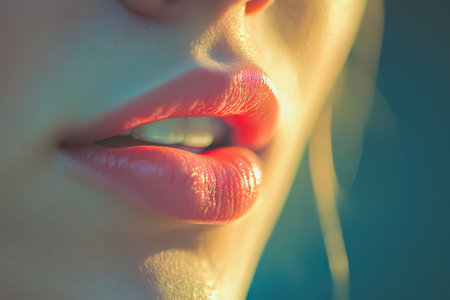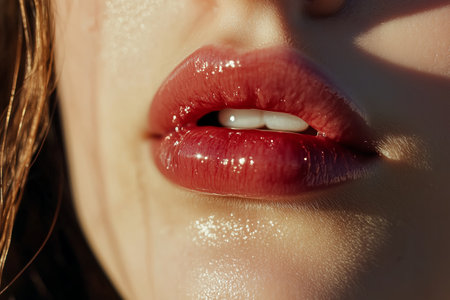 Dewy Lips Glimmering Under Natural Light in a Close-Up Portrait During Golden Hour