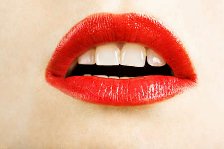 Passion. Sensual female lips. White healthy teeth. Mouth with teeth smile. Red lipstick and sexy kiss. Lips close up.