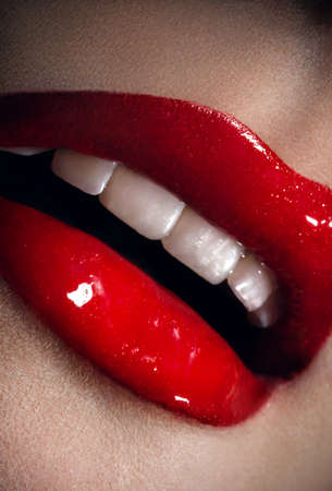 Red lipstick on a girl's lips close-up. Smile.