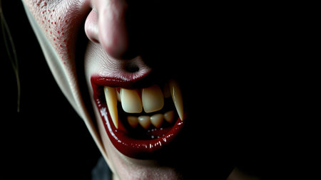 A chilling close-up of a vampire's mouth with sharp fangs and blood-red lips, creating a dark and eerie Halloween vibe. AI generation