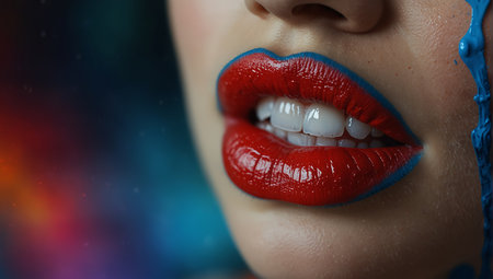 Striking close-up of glossy red lips amidst abstract paint swirls in hues of blue, orange, and pink.