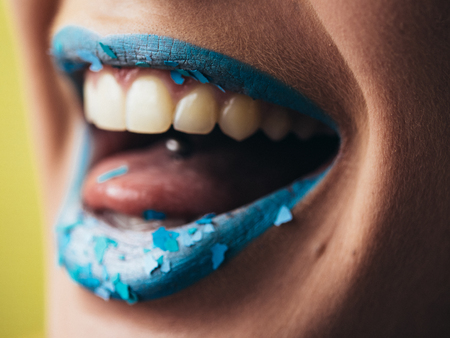 Anger mouth gesture of fashion model with sparkles on lips. Sinister and eerie smile. Jaws open, frightening or screaming woman. Macro view of glamorous make-up.