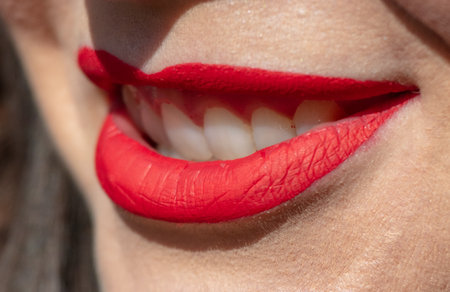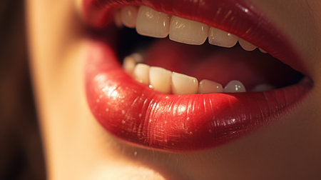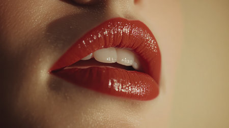 Close-up of full lips accentuated by vibrant red lipstick with a glossy finish. perfect for use in beauty and cosmetics advertising, makeup tutorials, and product promotions, emphasizing allure and sophistication.