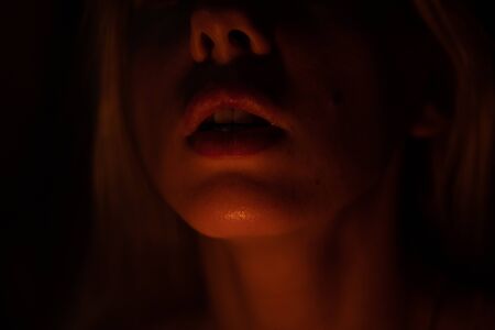 chin lips and neck are illuminated by a candle on a dark background