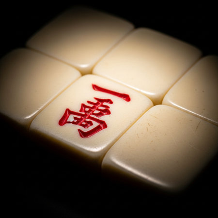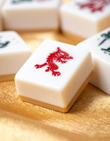 A close-up view captures the intricate detail of the Red Dragon Mahjong tile, a key piece in a game of strategy and luck.