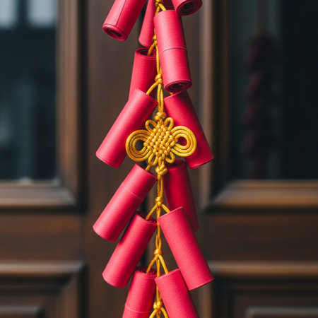 Traditional Chinese knots and coins symbolize prosperity and good fortune, enhancing the festive spirit for Chinese New Year celebrations.