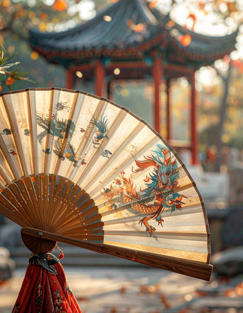 An ornate traditional Chinese fan, adorned with mythical dragons, rests in the foreground, its delicate paper capturing the warm glow of the setting sun.