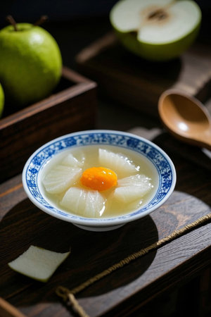 Blue and white porcelain bowl shaped pear soup food ingredients