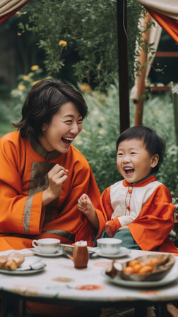 Generative AI : Middle aged mom smile joy look at young grown up kid child with love care good warm time Asia people woman adult older mum parent sitting at home night dinner outdo