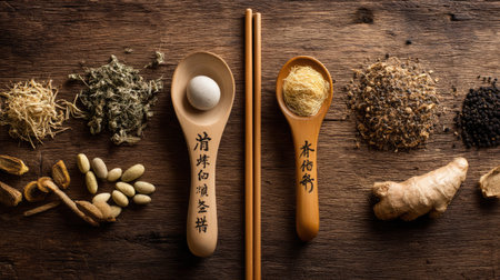 An artistic arrangement of traditional culinary ingredients, featuring wooden spoons filled with herbs and spices on a rustic wooden surface, showcasing natural textures and earthy tones.