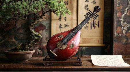 A beautifully crafted traditional string instrument rests beside a bonsai plant and ancient scrolls. The rich textures and warm lighting create a peaceful ambiance.