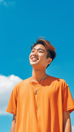 Generative AI : Candid of young attractive asian man close eyes deep breath and wide open arms in blue sky view background feeling wind and sunshine Happy asian hipster male in you