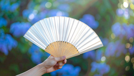 A hand holds a white folding fan open against a blurred background of blue and purple flowers, illuminated by sunlight.