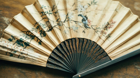 A close-up of a Chinese fan with delicate hand-painted designs. No people, copy space.