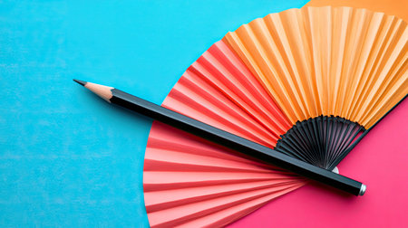 This image features a vibrant paper fan in warm colors alongside a pencil on a contrasting background of cool tones, ideal for inspiring creativity and design.