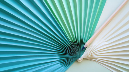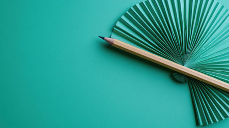 This beautifully arranged image features a pencil and a fan-shaped paper art piece on a turquoise background, creating a serene and modern aesthetic, perfect for design inspiration.