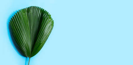 top view of exotic palm leaf on blue background with copy space, flat lay