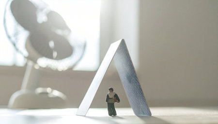 In a world of overwhelming forces, a tiny businessman finds a moment of refuge under a simple, fragile shelter.