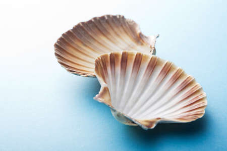Aesthetic top view of white seashells on dark background. Sun rays, minimalist sea concept. Generative AI.