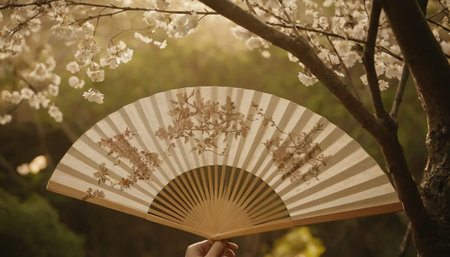 Japanese woman holding a bamboo fan in front of cherry blossoms.