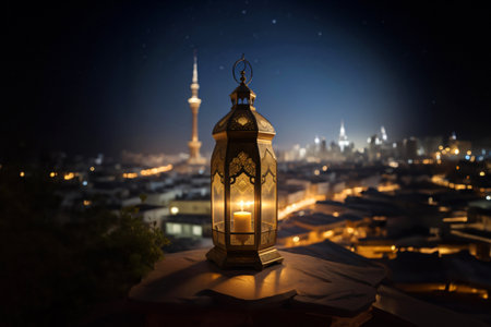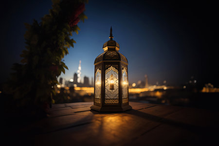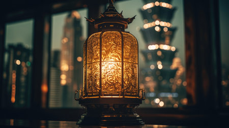Lantern for Ramadan Kareem with blurred cityscape background.
