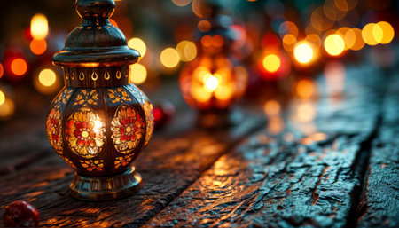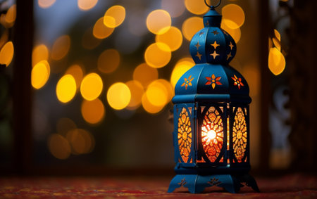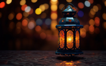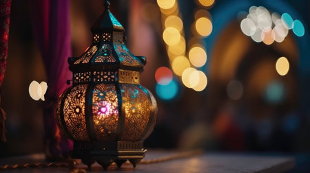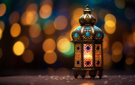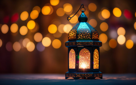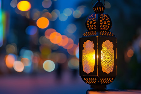 islamic lantern with bokeh lights in the background for adha and fitr eid