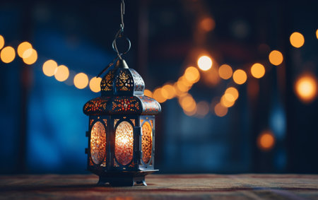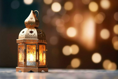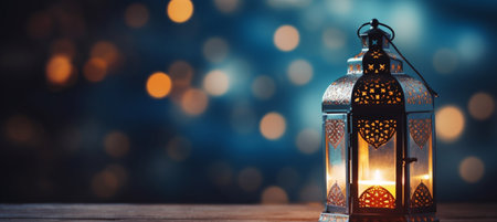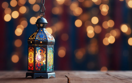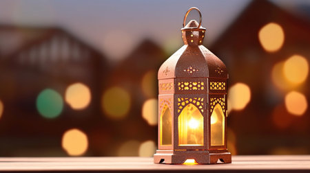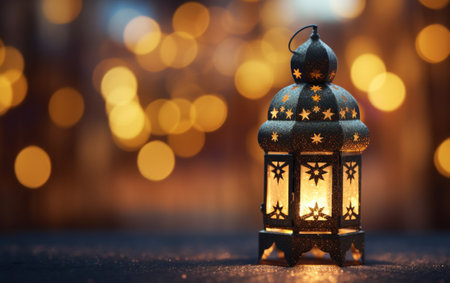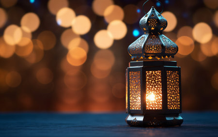 Side view of Ramadan lantern with side empty space with fuzzy bright lights in the background