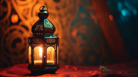 Feast of sacrifice, one of the two main Muslim holidays Eid al-Adha, religious traditional light culture arabic musulman spirituality, banner copy space background lamp