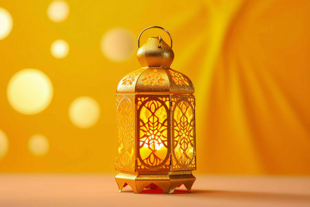 A golden lantern with designs stands intricately illuminated against a backdrop of soft, golden bokeh lights.