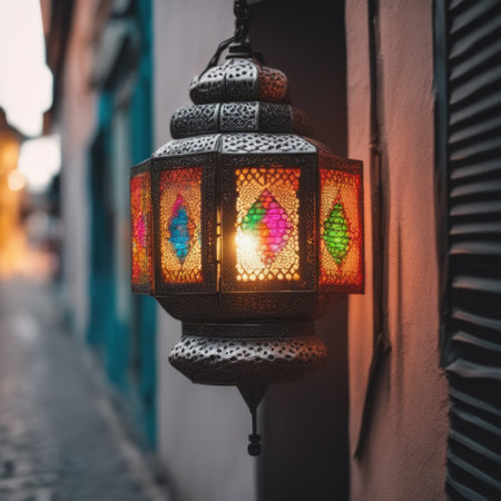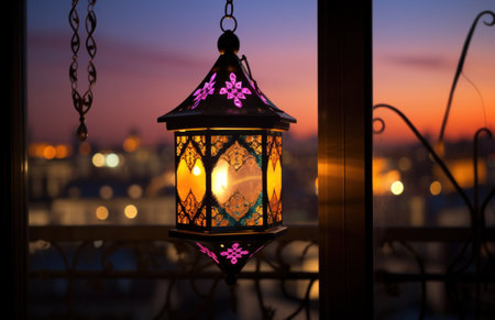 Traditional arabic lantern hanging outdoors, emitting a warm, inviting light as the sun sets, creating a serene ambiance