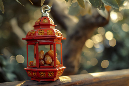 features dates and traditional lanterns on a wooden background, representing the festive spirit of Ramadan.