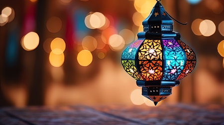 Lantern with colorful bokeh lights for Islamic new year and Ramadan Kareem concept.