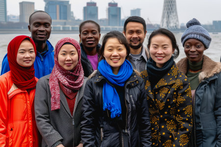 A diverse group of Muslim women in colorful hijabs stands confidently together. They share smiles and camaraderie enjoying a moment of togetherness and happiness. Beautiful young women. Generative AI.