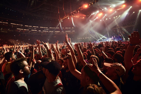A large group of enthusiastic fans gathered together at a concert venue, enjoying the live music and energetic atmosphere, A crowded concert venue packed with excited fans